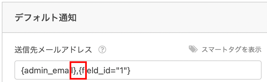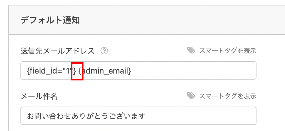 「スマートタグを表示」から{field_id=”1″}を追加した場合、このように追加されます。