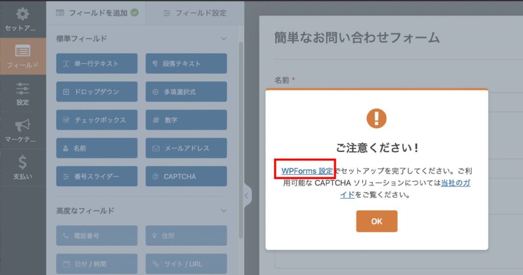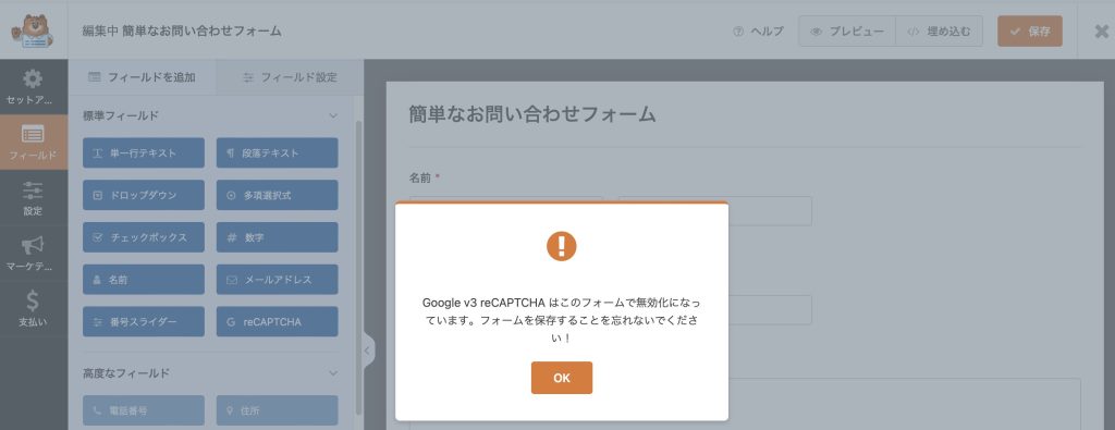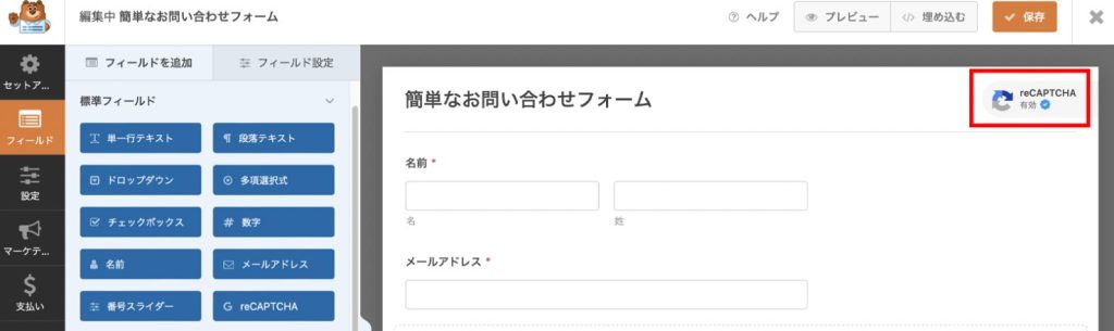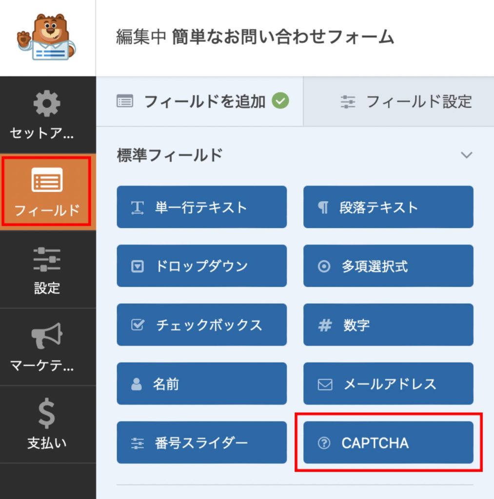 再びWPFormsで作ったフォームに戻り、「フィールド」から「reCAPTCHA」をクリック。