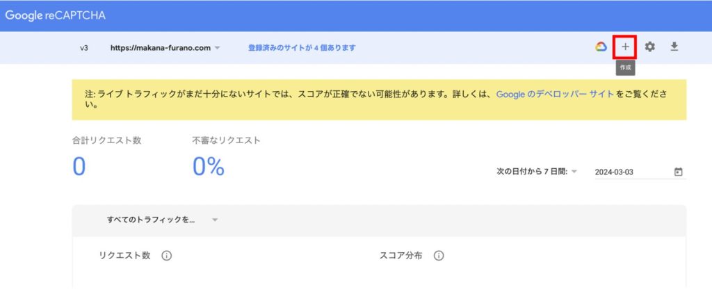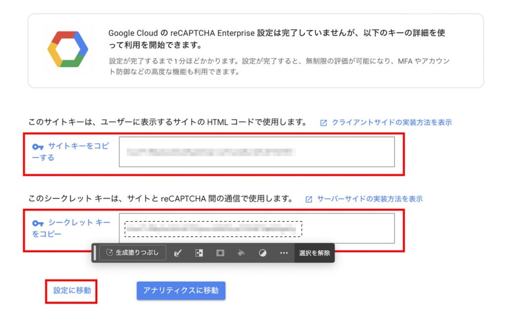 「サイトキー」と「シークレットキー」をメモ帳などにコピーしておきます。