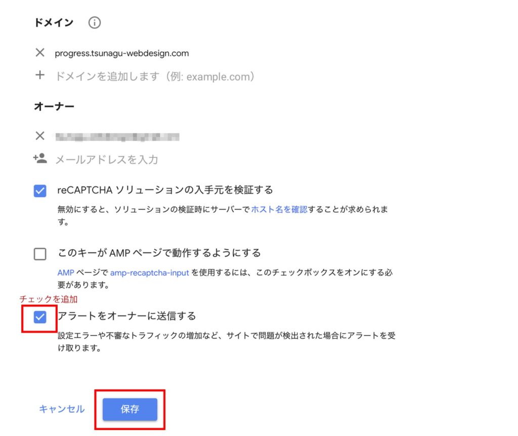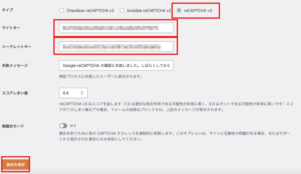 「サイトキー」と「シークレットキー」に、reCAPTCHAでコピーしたキーをペーストする。