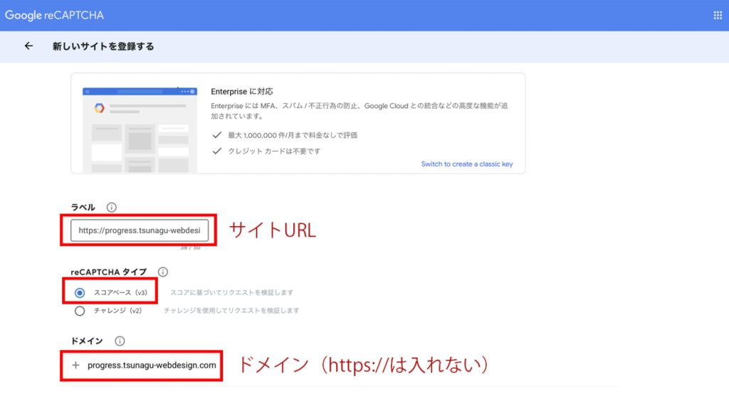 デフォルトではタイプが「Checkbox reCAPTCHA v2」に選択されているので注意!