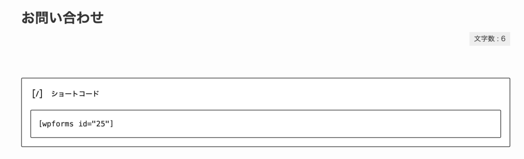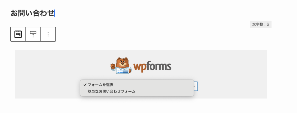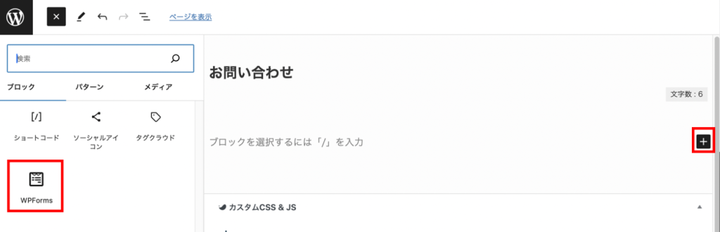 フォームを埋め込みたいページの任意の箇所でブロックエディター「WPForms」を追加します。
