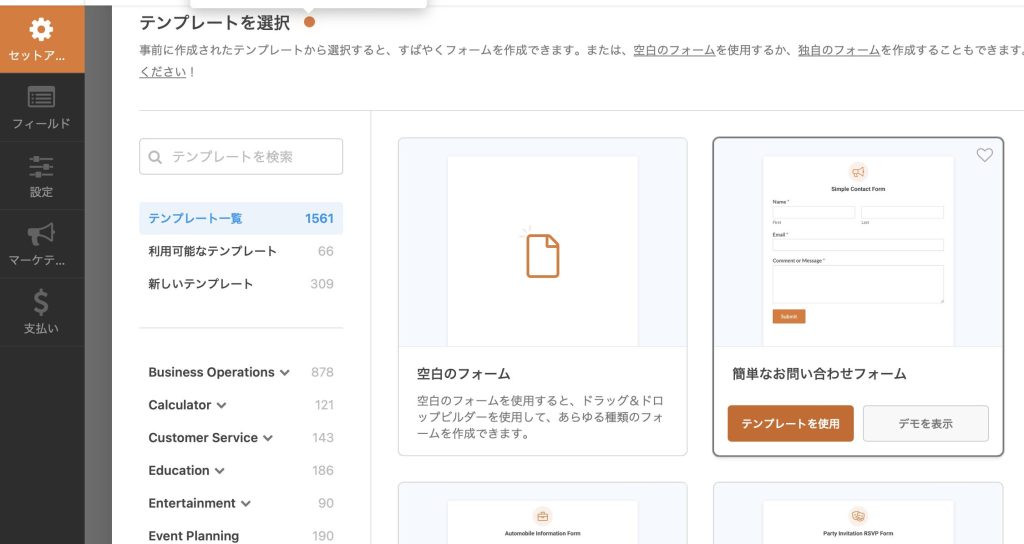 何でも良いので、とりあえず今回は「簡単なお問い合わせフォーム」のテンプレートを使います。