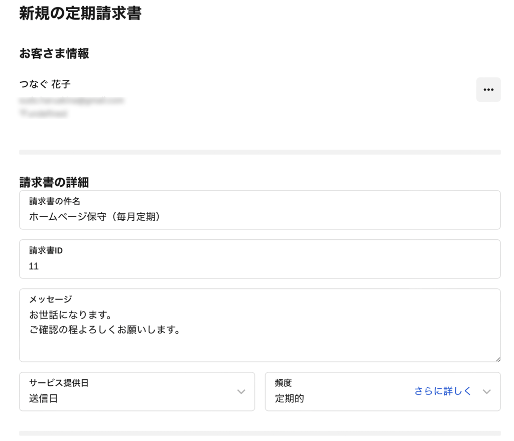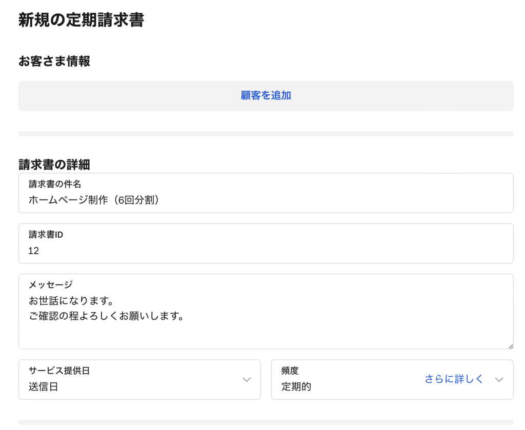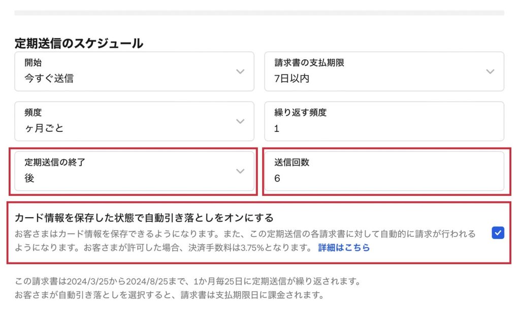 分割請求をしたい場合、サブスク請求との違いはこちらの「定期送信の終了」を「後」を選択し、「送信回数」に分割したい回数を入力。