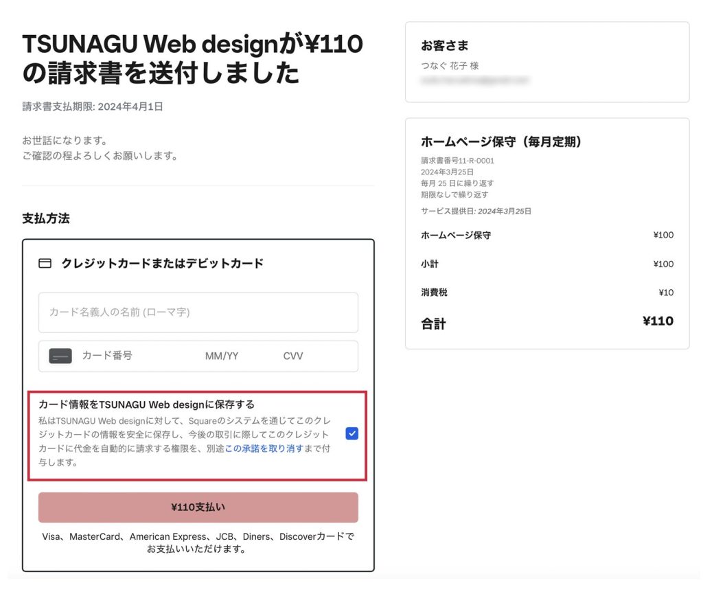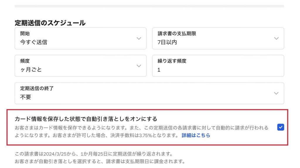 カード情報を入力する画面になるので、この時に「カード情報を⚫︎⚫︎⚫︎⚫︎(自社名)に保存する」という欄にチェックを入れてもらうようにご案内しましょう。ここにチェックを入れ忘れても、請求書は設定したサイクルで自動で送られます。