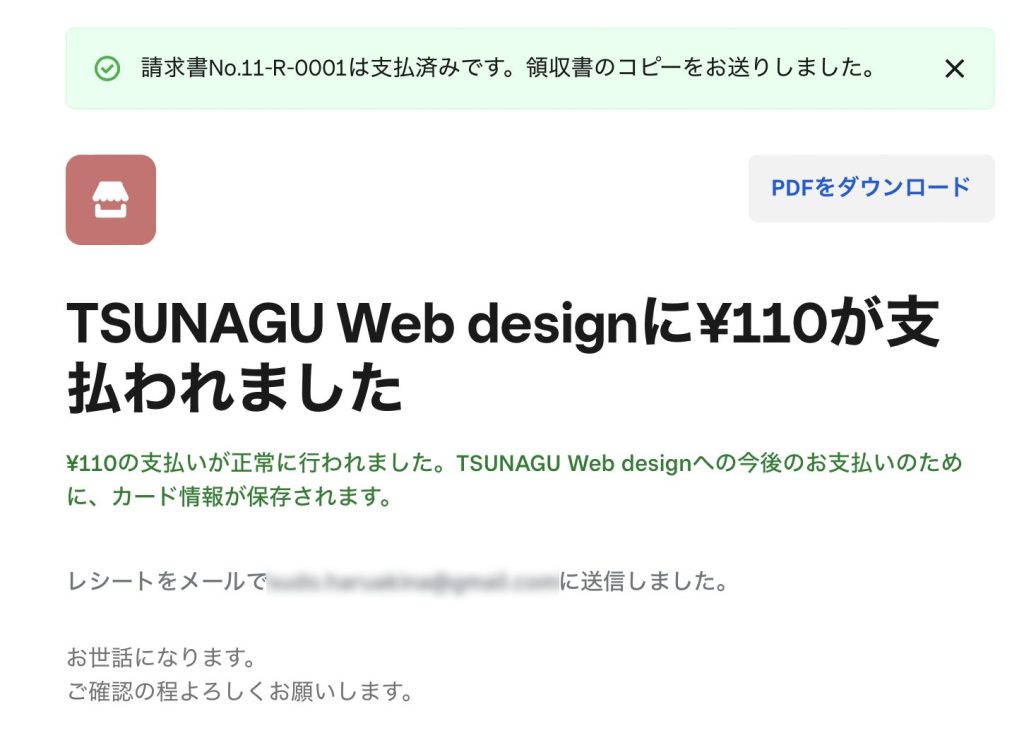 カード情報を入力し、「支払い」をクリックすると次の画面へ。